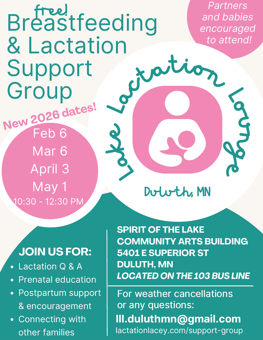 History: For many years, dedicated volunteers hosted regular La Leche League meetings in the Duluth area. This act of care benefited an untold number of families. Several years after the long time leaders retired, Rosalyn and Lacey brought La Leche League back to Duluth. In 2025, the midwest governing body of La Leche League lost its leadership. In order to continue offering free support, Rosalyn and Lacey continue their group with the similar triple L acronym: Lake Lactation Lounge. Our meeting space is generously donated by Spirit of the Lake Community Arts.